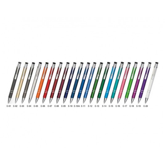 - Długopisy reklamowe COSMO wykonane są z aluminium z chromowanymi elementami. - Dostępne w 3 wariantach wykończenia powierzchni: matowe, błyszczące i lakierowane. - Dostępne różne kolory m.in: - C-01 czarny wersja błyszcząca - C-02 szampański wersja błyszcząca - C-03 grafitowy wersja błyszcząca - C-04 srebrny wersja matowa - C-05 pomarańczowy wersja matowa - C-06 czerwony wersja matowa - C-07 bordowy wersja błyszcząca - C-08 purpurowy wersja błyszcząca - C-09 ciemny fiolet wersja błyszcząca - C-10 ciemnoniebieski wersja matowa - C-10 A niebieski wersja matowa - C-11 błękitny wersja błyszcząca - C-12 zielony wersja błyszcząca - C-13 ciemnozielony wersja błyszcząca - C-14 turkusowy wersja matowa - C-15 aquamarina wersja matowa - C-16 różowy wersja matowa - C-17 jasnozielony wersja błyszcząca - C-18 jasna purpura wersja błyszcząca - C-19 jasny fiolet wersja błyszcząca - C-20 biały lakier