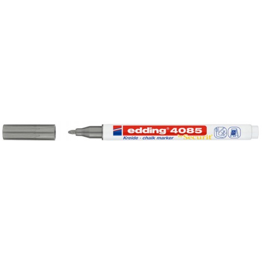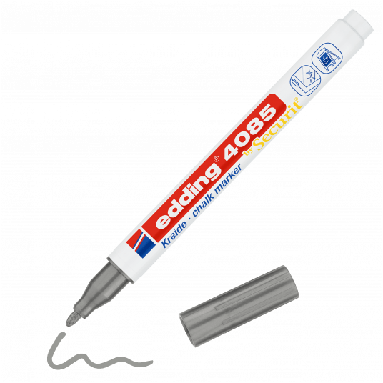 - Marker na bazie płynnej kredy, z okrągłą końcówką, o neutralnym zapachu. - Doskonały do wykonywania napisów i zdobień na oknach, witrynach i innych gładkich powierzchniach. - Zmywalny za pomocą mokrej ściereczki. - Przepływ tuszu regulowany zaworem. - Linia markerów 4085 została stworzona we współpracy ze znanym producentem markerów i tablic- Securit. - Szerokość linii pisania 1-2 mm. - Kolor srebrny.