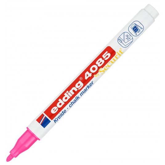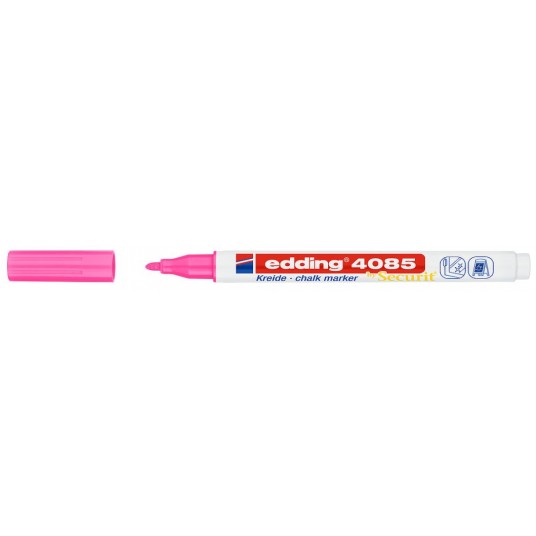 - Marker na bazie płynnej kredy, z okrągłą końcówką, o neutralnym zapachu. - Doskonały do wykonywania napisów i zdobień na oknach, witrynach i innych gładkich powierzchniach. - Zmywalny za pomocą mokrej ściereczki. - Przepływ tuszu regulowany zaworem. - Linia markerów 4085 została stworzona we współpracy ze znanym producentem markerów i tablic- Securit. - Szerokość linii pisania 1-2 mm. - Kolor różowy neonowy.