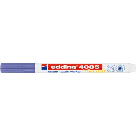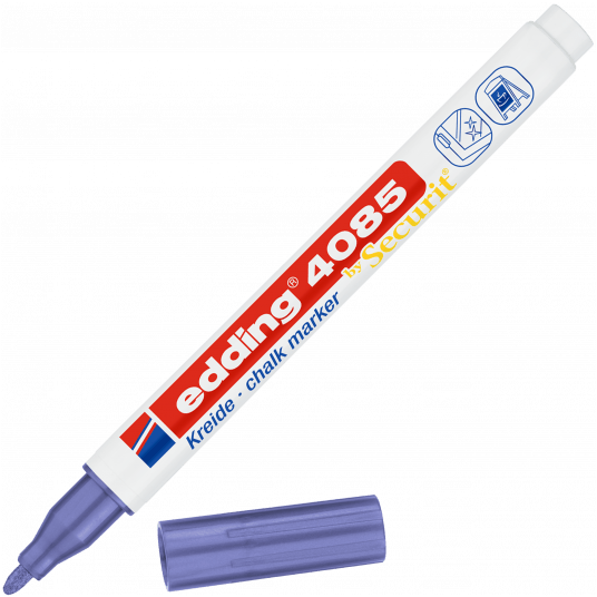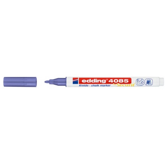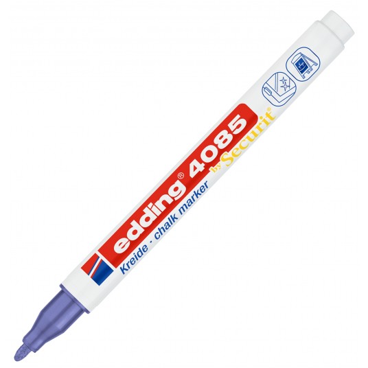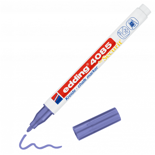 - Marker na bazie płynnej kredy, z okrągłą końcówką, o neutralnym zapachu. - Doskonały do wykonywania napisów i zdobień na oknach, witrynach i innych gładkich powierzchniach. - Zmywalny za pomocą mokrej ściereczki. - Przepływ tuszu regulowany zaworem. - Linia markerów 4085 została stworzona we współpracy ze znanym producentem markerów i tablic- Securit. - Szerokość linii pisania 1-2 mm. - Kolor fioletowy metaliczny.