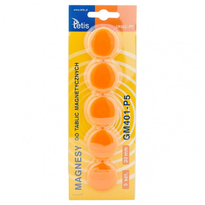 - Magnesy Tetis są niebywale mocne i trwałe, zapewniają prosty i praktyczny sposób przymocowania dokumentu lub notatki do powierzchni magnetycznych - Doskonałe do tablic i innych powierzchni magnetycznych - Pakowane na blistrze - Średnica: 30 mm - Kolor: pomarańczowy - Wzór: gładkie - Ilość: 5 sztuk