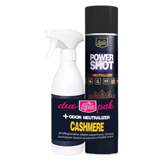 - Kala DUO PAK to dwa bardzo wysokiej jakości oraz skuteczności produkty: olejek zapachowy Kala Chanti oraz neutralizator i odświeżacz w jednym dużych przestrzeni Power Shot - Oba produkty łączy jeden zapach i promocyjna cena - Olejek zapachowy Kala Chanti Cashmere to profesjonalny olejek zapachowy na bazie perfum o długotrwałym, mocno pachnącym działaniu - Zawiera aktywne neutralizatory nieprzyjemnych zapachów - Dzięki skoncentrowanym, naturalnym składnikom pozostawia przyjemny zapach trwający kilkukrotnie dłużej niż inne produkty do aromatyzacji - Kala Power Shot Cashmere to produkt z rewolucyjnym sposobem dozowania, dzięki któremu jedno naciśnięcie wystarcza na ok. 200 m3 - Produkt posiada w składzie substancje czynne, dzięki którym ma wysoką skuteczność w eliminowaniu nieprzyjemnych zapachów tzw. neutralizatory nieprzyjemnych zapachów - Substancje czynne nie zawierają metali ciężkich a środek spulchniający nie zawiera substancji szkodliwych dla oczu - CASHMERE to prestiżowy zapach tajemniczości orientu, w którego składzie odnajdziemy orientalną wanilię, a także nuty żywiczne, drzewne, ambrowe