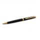 Długopis klasyczny o smukłej, prostej linii. Pokryty czarnym błyszczącym lakierem. Wykończenia platerowane 23-karatowym złotem. Wyposażony w obrotowy mechanizm wysuwania wkładu. Długopis posiada wkład w kolorze niebieskim.