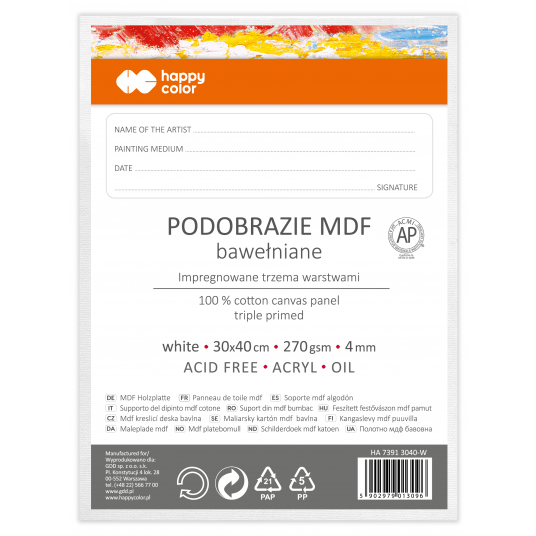 - Bawełniane podobrazie na płycie MDF - Przeznaczone do prac z farbami akrylowymi i olejnymi - Do pracy w pomieszczeniach oraz w plenerze - Bawełna wolna od wszelkich kwasów wybielających - Płyta MDF zabezpieczona przed nadciąganiem wilgoci - Przeznaczone do farby akrylowych, farb olejnych, farb akwarelowych - Gramatura bawełny: 270 g/m2 - Kolor: biały - Rozmiar: 30 x 40 cm