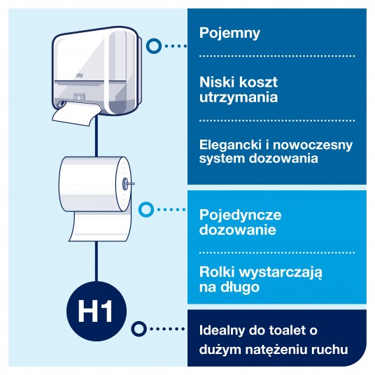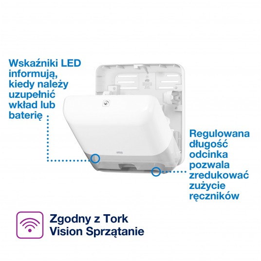 - Tork Matic® dozownik do ręcznika w roli z sensorem Intuition™ z linii Elevation zapewnia gościom wyjątkowe, bezdotykowe osuszanie rąk - Dozowniki Tork Elevation wyróżniają się praktycznym i nowoczesnym wyglądem, który zapada w pamięć gości - Dozowanie po jednym odcinku zmniejsza zużycie i poprawia higienę - Łatwy w obsłudze dzięki wskaźnikowi poziomu LED, który informuje o potrzebie wymiany wkładu - Opcja regulowana długość ręcznika pozwala wybrać odpowiedni rozmiar, idealny dla Twojej firmy - System: H1 (system ręczników do rąk w roli) - Wysokość: 36,8 cm - Szerokość: 20,6 cm - Długość: 33,1 cm - Materiał: plastik - Kolor: biały