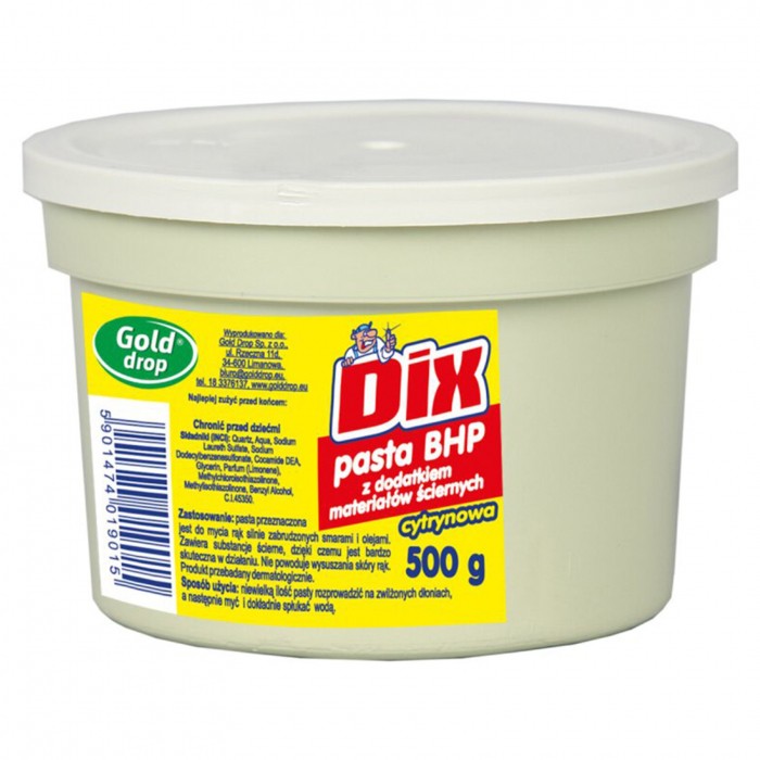 - Pasta przeznaczona jest do mycia rąk silnie zabrudzonych - Zawiera substancje ścierne oraz środek nawilżający i natłuszczający, który tworzy warstwę ochronną zapobiegającą wysuszaniu skóry rąk - Zalecana jest do stosowania w warsztatach mechanicznych i innych, do mycia rąk silnie zabrudzonych smarami i olejami - Bardzo wydajna i ekonomiczna w użytkowaniu - Jest produktem całkowicie niegroźnym dla środowiska, ponieważ jego składniki ulegają biodegradacji - Opakowanie 500g