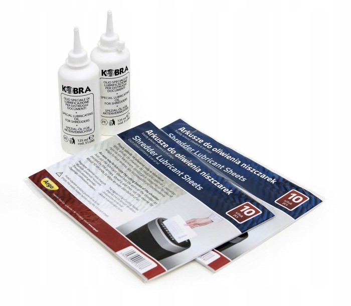 - Dużo prostsze w użyciu niż olej w butelce, wystarczy tylko zniszczyć arkusz w niszczarce, a olej zostanie rozprowadzony po nożach tnących