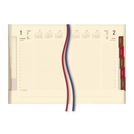 - Format: A5 - Układ kalendarium: 1 dzień - 1 strona + dodatkowe strony po zakończeniu miesiąca - Ilość stron: 384 - Druk: 2 kolory - Rodzaj papieru: offset 70g/m2, kremowy - Wkładka - miniatlas samochodowy Polski, - Wyklejka - mapa polityczna Europy - Oprawa - skóropodobna, wycięty register dwuprzebiegowy, dwie tasiemki, perforowane narożniki