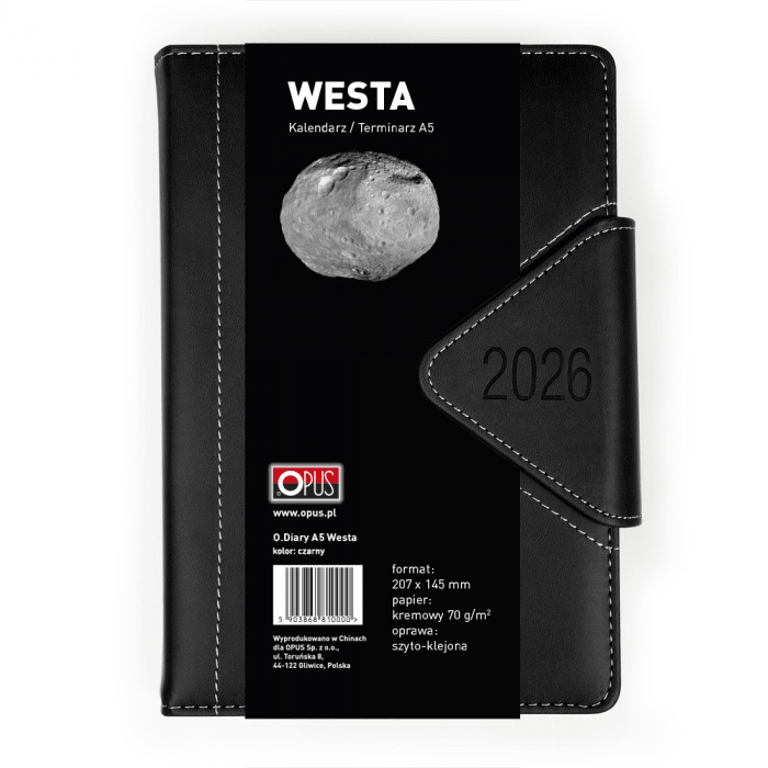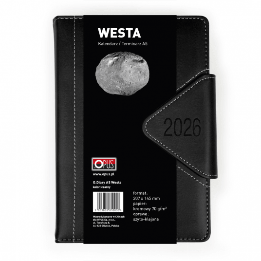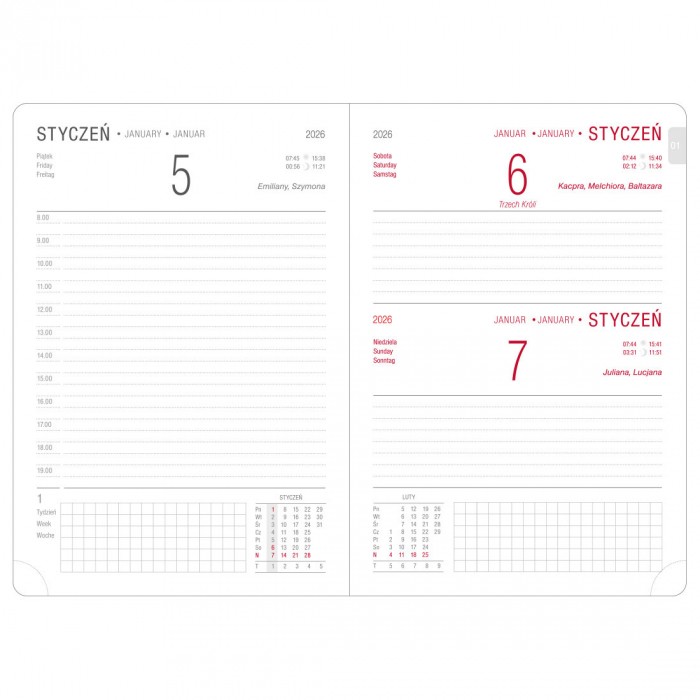 - Format: A5 - Ilość stron: 330 - Kolor papieru: kremowy - Gramatura papieru: 70 g/m² - Rodzaj oprawy: szyto-klejona - Eleganckie tłoczenie - Miejsce na przybory do pisania - Plan roczny - Zaznaczone święta, imieniny oraz wschody i zachody słońca i księżyca - Dzień na stronie (sobota i niedziela na jednej stronie) - Podział godzinowy dnia roboczego: 8:00 – 19:00 - Skrócony kalendarz bieżącego i następnego miesiąca na każdej rozkładówce - Dodatkowe miejsce na notatki - Registry drukowane - Zakładka tasiemkowa - Perforowane narożniki