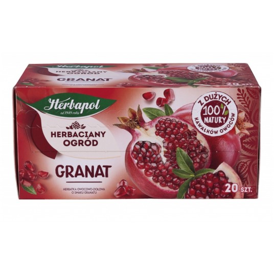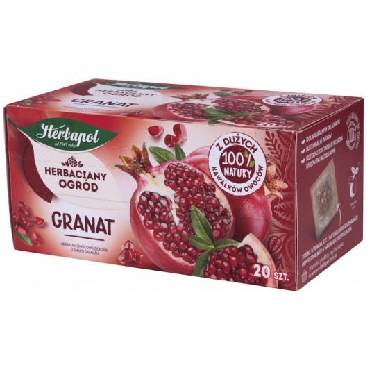 - Herbatka owocowo-ziołowa o smaku granatu - Rozsmakuj się w aromatycznej herbatce owocowo-ziołowej o smaku granatu - Jej receptura została opracowana z największą starannością z myślą o Tobie i Twojej rodzinie - Orzeźwiająca herbatka doskonale smakuje zarówno na ciepło, jak i po wystudzeniu, skutecznie gasząc pragnienie - Idealna na każdą porę dnia i roku - Herbatki z linii Herbaciany Ogród to herbatki owocowe o doskonałym smaku - Wyselekcjonowane i starannie zebrane owoce poddawane są dokładnej kontroli, a następnie starannie pakowane tak, aby chronić całe dobrodziejstwo natury - To 100% naturalnych składników - Każda herbatka zapakowana jest w przezroczyste saszetki, przez które ujrzysz duże kawałki owoców, dzięki którym napój jest wyjątkowo smaczny i aromatyczny - Torebka wykonana jest z materiału biodegradowalnego i kompostowalnego w warunkach przemysłowych - Herbatka owocowa nie zawiera teiny, co sprawia że można ją pić o dowolnej porze dnia - Szeroki wybór wariantów smakowych sprawia, że herbatki owocowe z linii Herbaciany Ogród mogą pić wszyscy członkowie rodziny – również dzieci - Produkt zawiera wyłącznie naturalne składniki - Skład: jabłko, kwiat hibiskusa, owoc dzikiej róży, aromaty naturalne, nasiona granatu (0,3%) - Zawartość opakowania: 50 g (20 saszetek x 2,5 g)