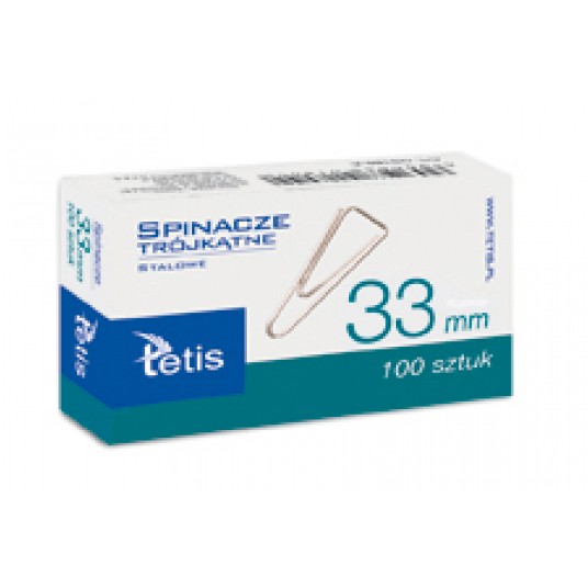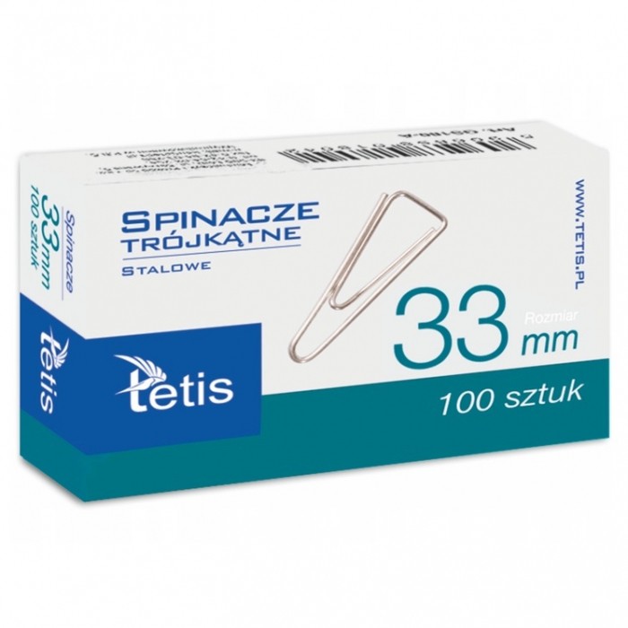 - Spinacze stalowe - Kształt: trójkątne - Opakowanie: pudełko 100 sztuk / 10 pudełek po 100 sztuk w opakowaniu zbiorczym - Kolor: srebrny - Rozmiar: 33 mm