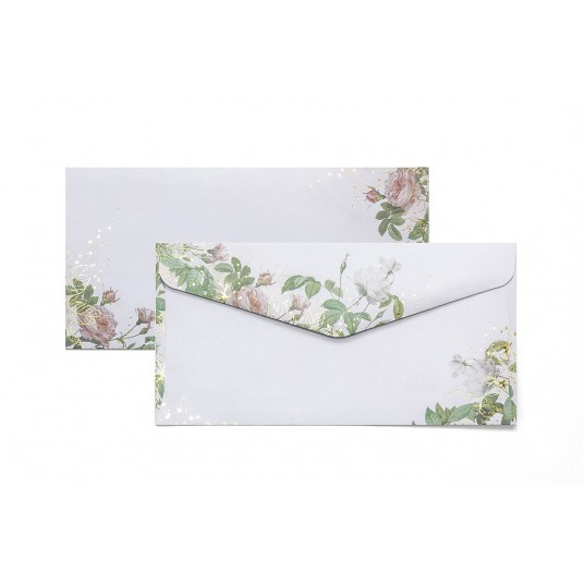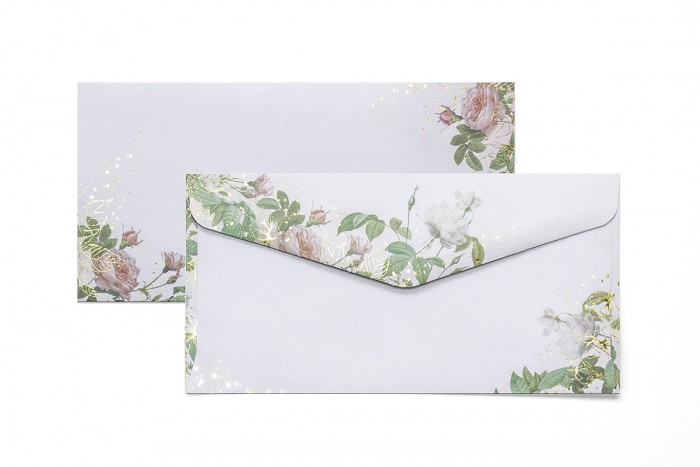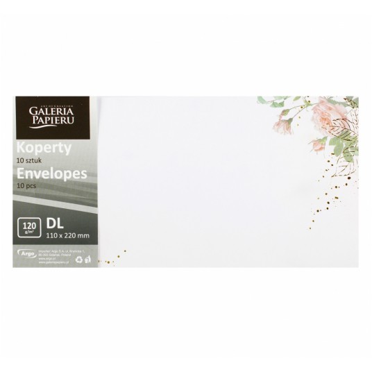 - Elegancka koperta do korespondencji oraz kartek okolicznościowych - Koperta z nadrukiem i elementami wzoru zdobionymi błyszczącą folią - Klejona na mokro - Format: DL (110 x 220 mm) - Gramatura: 120 g/m2 - Ilość: 10 sztuk w opakowaniu