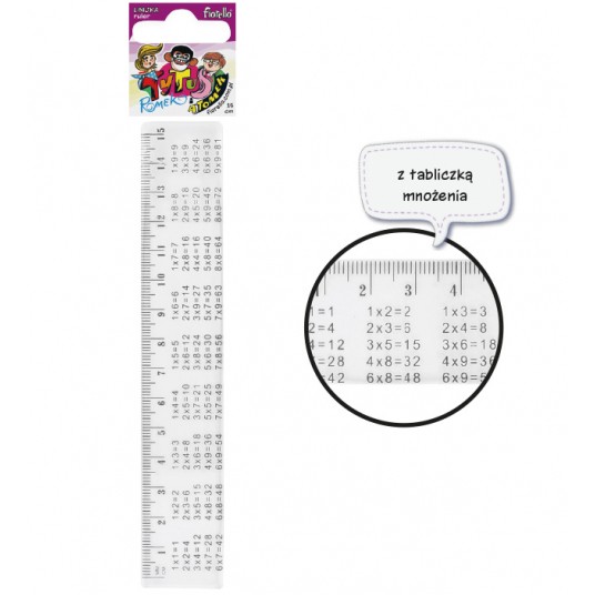 - Wytrzymała, sprężysta, wykonana z polistyrenu linijka z tabliczką mnożenia - Długość 15 cm - Edycja limitowana - Linijka pakowana pojedynczo w zawieszki
