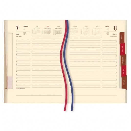 - Terminarz dzienny Senator - Format: A5 - Rodzaj papieru: offset 70g/m2 kremowy - Układ kalendarium: 1 dzień - 1 strona + dodatkowe strony po zakończeniu miesiąca - Ilość stron: 384 - Druk: 2 kolory - Wkładka - miniatlas samochdowy Polski - Wyklejka - mapa polityczna Europy - Oprawa - skóropodobna, wycięty register dwuprzebiegowy, dwie tasiemki, perforowane narożniki