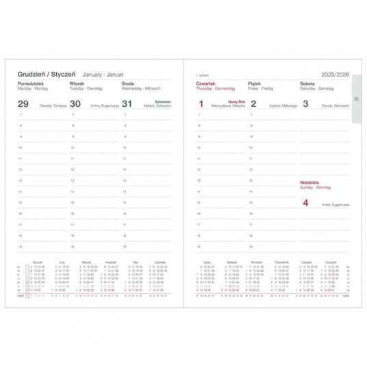 - Terminarz w układzie tygodniowym, drukowany na papierze białym, kolor druku szary, registry drukowane
