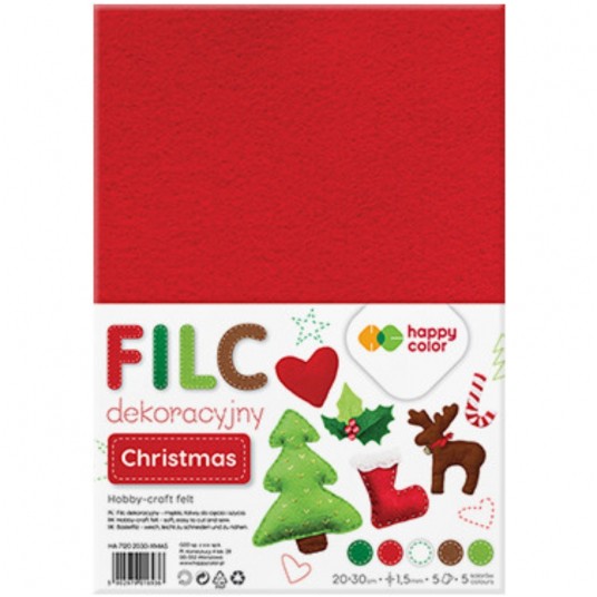 - Miękki, łatwy do sklejania i zszywania - Miękki filc dekoracyjny łatwy do cięcia i szycia - Niezastąpione do zdobienia kartek okolicznościowych, zaproszeń, pamiętników i innych - Grubość 1,5 mm - Format 20 x 30 cm - Ilość: 5 arkuszy w opakowaniu - Mix kolorów: brązowy, ciemnozielony, jasnozielony, biały, czerwony - Motyw: świąteczny