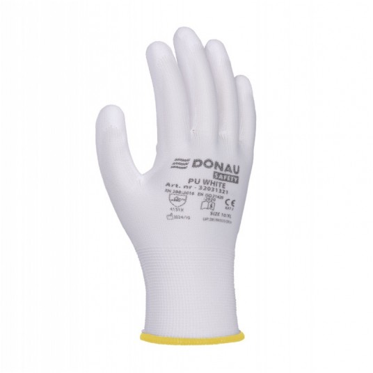 - Rękawice wykonane z dobrej jakości dzianiny poliestrowej w kolorze białym, powleczone w części chwytnej białym poliuretanem - Przeznaczone do prac montażowych, magazynowych, mechanicznych, elektrotechnicznych, serwisowych, malarskich, remontowych, przemysłowych, ogrodowych oraz zajęć hobbistycznych - Powłoka z białego poliuretanu o wysokiej odporności na ścieranie - Zakończone elastycznym ściągaczem - Rękawice ochronne chroniące przed uszkodzeniami mechanicznymi - Kat: II - Zgodność z normami EN 388:2016+A1:2018 (4131X), EN ISO 21420:2020 - Ścieg: 13g - Materiały: poliester/poliuretan - Kolor: biały - Rozmiar: 8