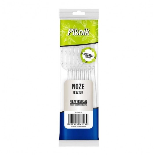 - Noże wielokrotnego użytku "Piknik" są wykonane wyłącznie z najwyższej jakości surowców - Posiadają niezbędne atesty dopuszczające do kontaktu z żywnością - Do wielokrotnego użytku - 6 sztuk w opakowaniu