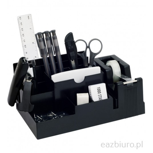– Przybornik na biurko wykonany z wytrzymałego tworzywa w kolorze czarnym.