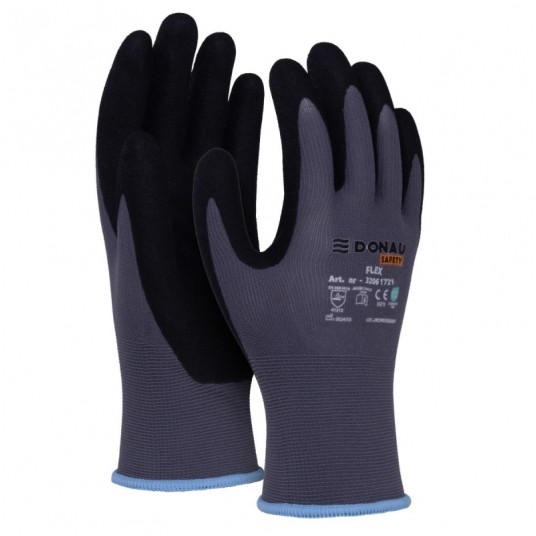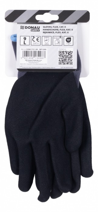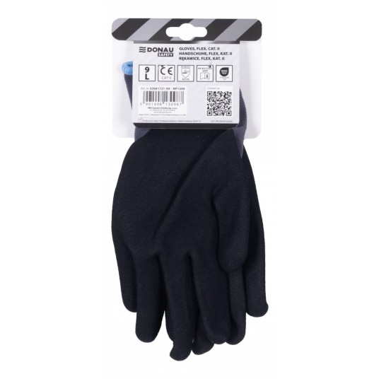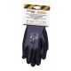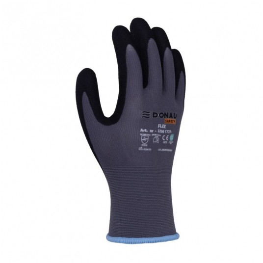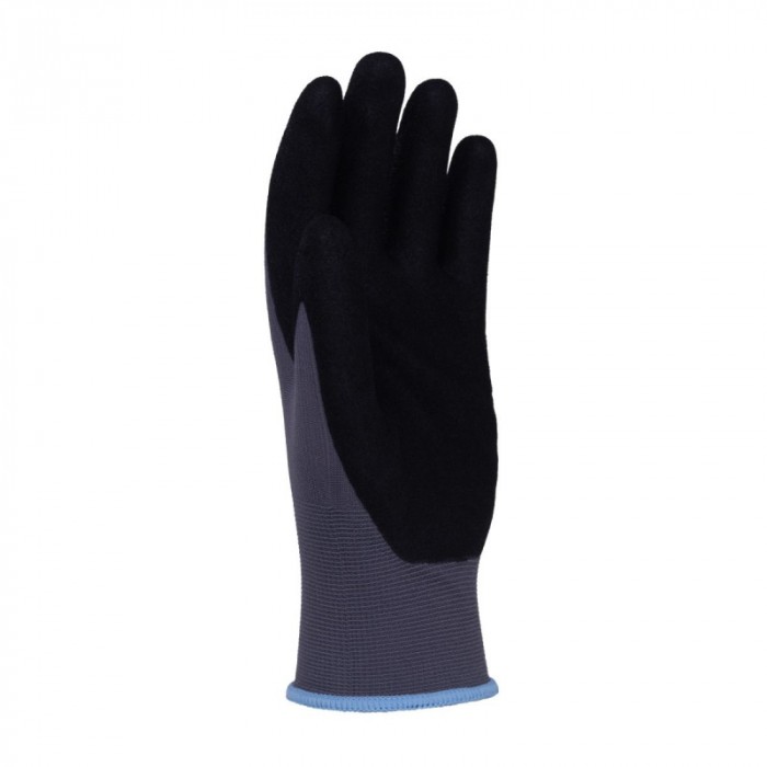 - Rękawice wykonane z dobrej jakości dzianiny nylonowej z elastanem w kolorze szarym, powleczone w części chwytnej ultradrobną pianką nitrylową w kolorze czarnym