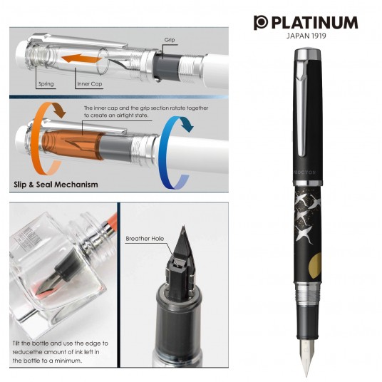 - Jest wyposażony w stalówkę w kształcie pięciokąta, wyprodukowaną w 1962 roku i wypełniającą atrament poprzez oryginalny wkład/konwerter Platinum