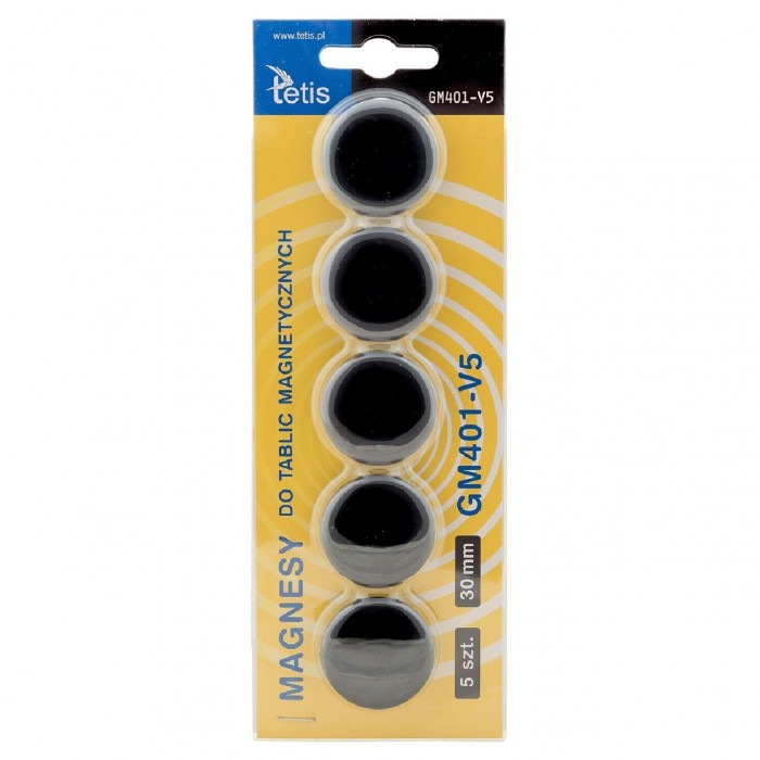 - Magnesy Tetis są niebywale mocne i trwałe, zapewniają prosty i praktyczny sposób przymocowania dokumentu lub notatki do powierzchni magnetycznych - Doskonałe do tablic i innych powierzchni magnetycznych - Pakowane na blistrze - Średnica: 30 mm - Kolor: czarny - Wzór: gładkie - Ilość: 5 sztuk