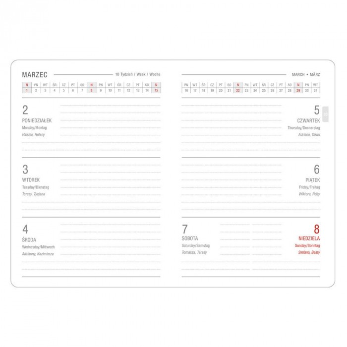 - Kalendarz tygodniowy - Plan roczny - Zaznaczone święta, imieniny i weekendy - Widok bieżącego miesiąca na każdej rozkładówce - Eleganckie tłoczenie - Dodatkowe miejsce na notatki - Kieszeń na luźne kartki i pętelka na długopis - Zakładka tasiemkowa - Okleina z efektem soft touch - Ilość stron: 128 - Gramatura papieru: 70 g/m² - Kolor papieru: biały - Format: A6