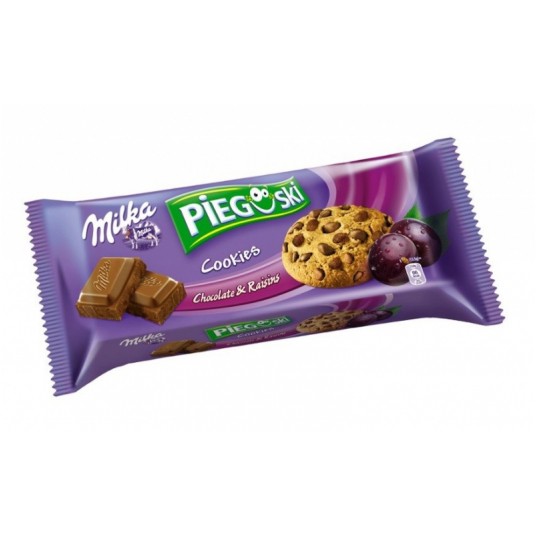 - Pieguski Milka Choco Cookies&Raisins to przede wszystkim połączenie smacznego, kruchego ciastka z drobnymi kawałkami mlecznej czekolady Milka i słodkimi rodzynkami