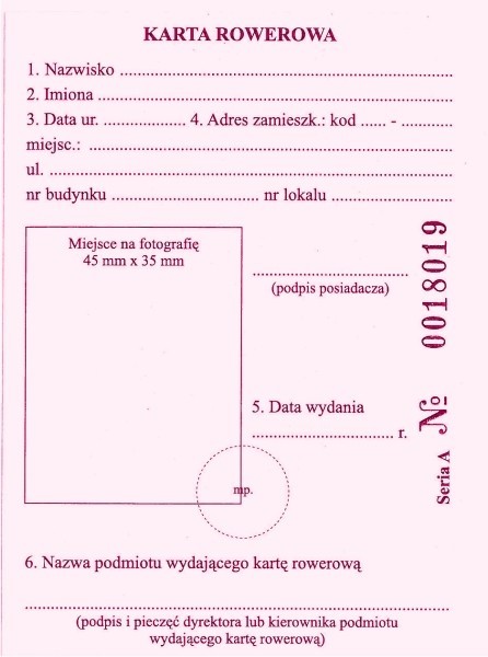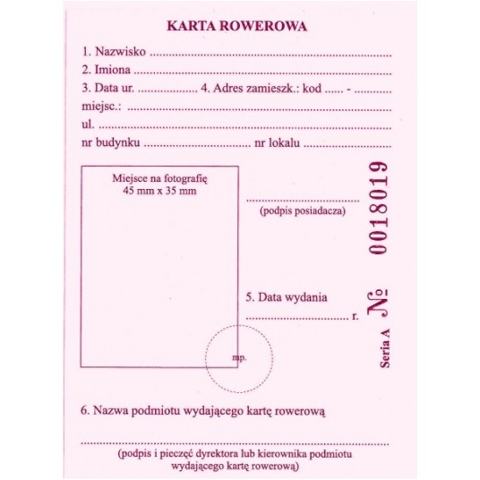 - Druk Karta rowerowa numerowana TYPOGRAF- Indeks: 02314- Format: A-7- Papier: Karton offsetowy- Bloczek: 50 sztuk