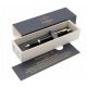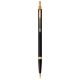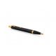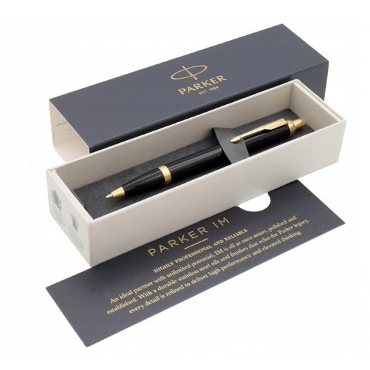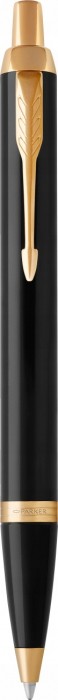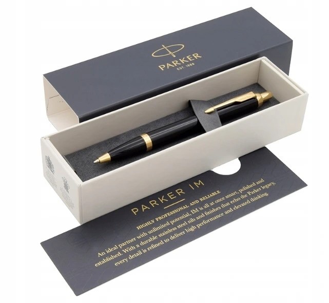 Na mosiężnej bazie położono kilkanaście warstw czarnego lakieru. Pierścienie wykończone złotem i polerowane. Część przednia wykonana z połyskującego, czarnego tworzywa sztucznego. Wyposażony w pstrykany system wysuwania wkładu. Idealny długopis Parker na prezent.
