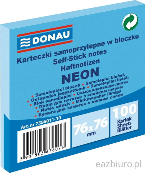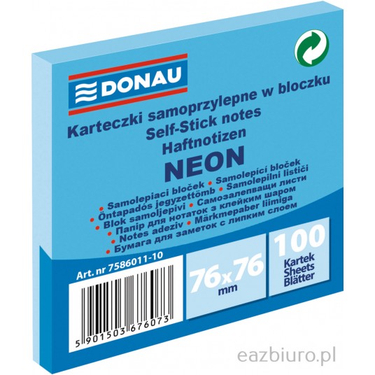 Bloczek samoprzylepny 76x76 mm Donau neon niebieski 100 kartek