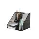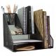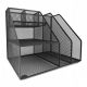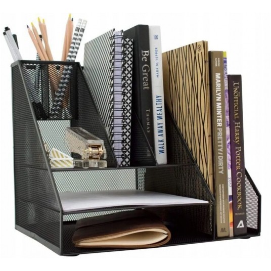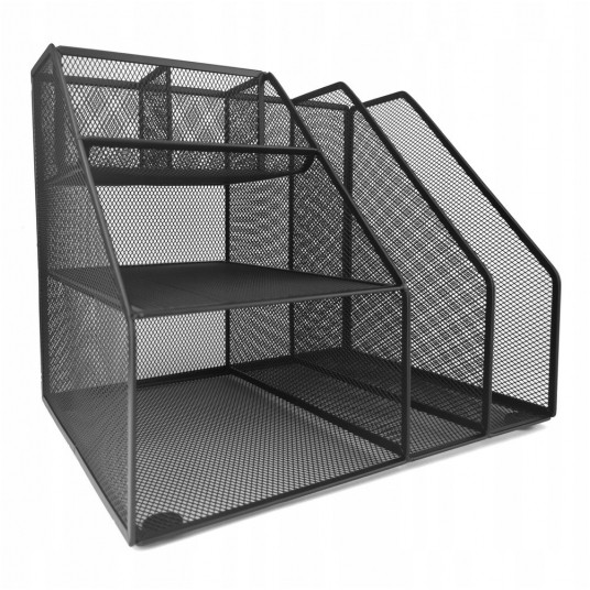 - Organizer z przybornikiem wykonany z metalowej siateczki powlekanej lakierem - 8 przegródek : 2 pionowe przegródki na artykuły piszące, 2 pionowe przegródki na korespondencje, 2 poziome przegródki na dokumenty A4, 1 pionowa przegródka o szerokość 11,5 cm na katalogi i segregator, 1 przegródka na karteczki lub inne artykuły biurowe np. zszywacz, dziurkacz - 4 antypoślizgowe nóżki - Wymiary: 345 x 290 x 295 mm - Kolor: czarny