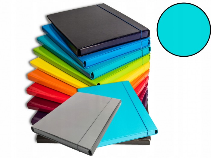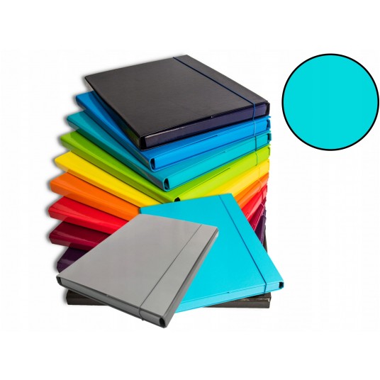 - Teczka skrzydłowa z gumką, wykonana z grubej tektury. - Powlekana folią polipropylenową z czarną wyklejką w środku. - Wyposażona w gumkę wzdłuż długiego boku. - Posiada trzy wewnętrzne klapki zabezpieczające dokumenty przed wypadnięciem. - Kolor: turkusowy - Format A4 - Dostępna z grzbietem 2 cm.