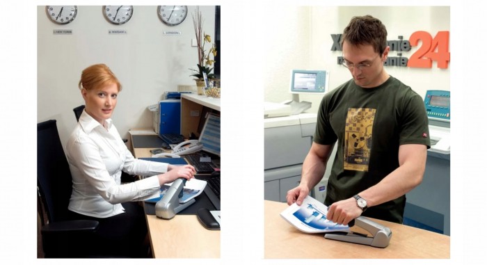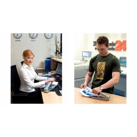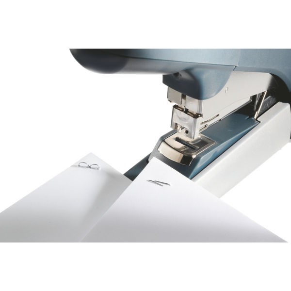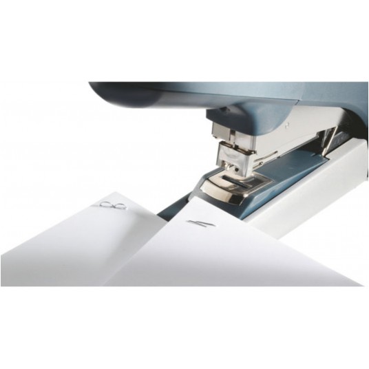 - Zszywacz z systemem płaskiego zaginania zszywek, dzięki któremu objętość zszytych dokumentów zmniejsza się o 30%, co w efekcie zwiększa pojemność segregatorów, koszulek lub teczek