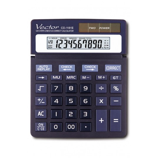 - 10 - pozycyjny wyświetlacz o regulowanym kącie nachylenia- Podwójne zasilanie- Zaokrąglanie wyników- Funkcja Check Correct 120 kroków przeglądania i korekty wykonywanych działań- Obliczanie marży- Klawisz zmiany znaku +/-- Klawisz podwójnego zera- Plastikowa obudowa i klawisze- 36 miesięcy gwarancji- Wymiary 151 x 120 x 20 mm