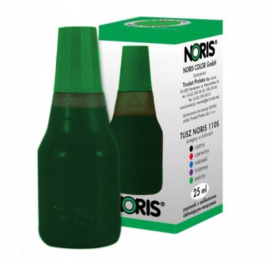 - Tusz wodny Noris 110S do znakowania papieru. - Do pieczątek ręcznych i samotuszujących, z gumową lub polimerową płytką stemplującą. - Buteleczka 25 ml z końcówką ułatwiającą nasączenie poduszek oraz nakrętką w kolorze tuszu. - Cena za sztukę