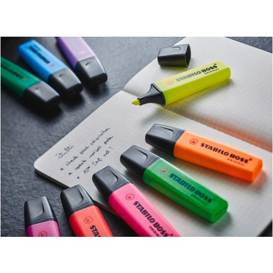- Wszystkie czarne elementy zakreślacza STABILO BOSS ORIGINAL wykonane są w 100% z surowców wtórnych