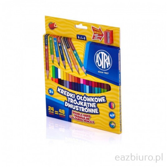 - Kredki ołówkowe dwustronne Astra - Kredki posiadają trójkątny kształt - W pudełku znajdują się 24 dwustronne kredki co daje do dyspozycji 48 kolorów - Intensywne kolory - Wysokiej jakości drewno ułatwia wygodne temperowanie kredek - Temperówka gratis w każdym opakowaniu podwójnych kredek Astra