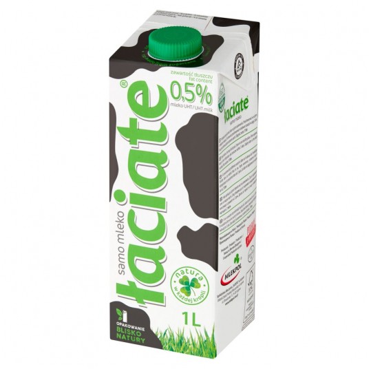 - Pyszne polskie mleko od krów karmionych paszami bez GMO– samo mleko - Doskonałe źródło wapnia i białka, bogactwo cennych witamin i składników mineralnych - Mleko Łaciate to niezmiennie od lat sprzedażowy hit - Polacy pokochali mleko UHT, bo dzięki sprawdzonej technologii i nowoczesnym opakowaniom zachowuje ono świeżość przez 6 miesięcy (do momentu otwarcia), nie tracąc smaku ani wartości odżywczych - Mleko UHT 0,5% - Nie zawiera środków konserwujących ani sztucznych dodatków - 1l