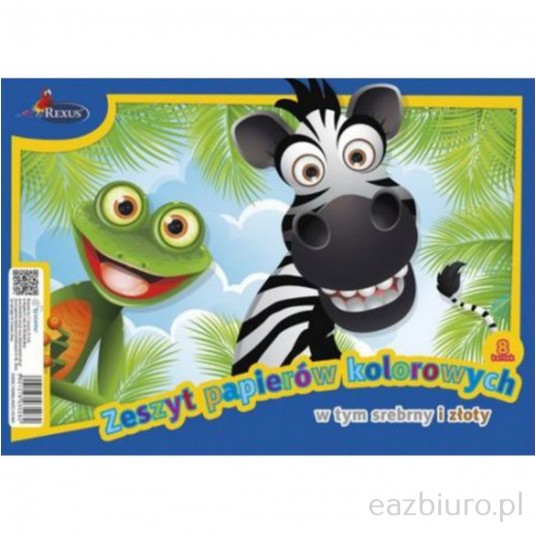 - Wycinanka papierów kredowanych rozmiar A4- 8 kartek połysk w kolorach: czerwony, żółty, pomarańczowy, zielony, niebieski, srebrny, złoty, czarny- Na przedzie kolorowa okładka nazwą produktu i kodem- Całość zszyta dwiema zszywkami płaskimi
