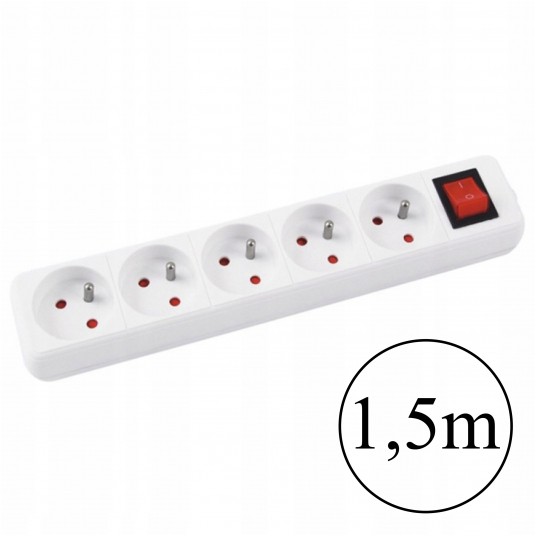 - Posiada wbudowany warystor w celu ochrony przed przepięciem - Wyposażony w zabezpieczenie przed dziećmi - Z wyłącznikiem - Długość przewodu: 1,5m - Ilość gniazd z uziemieniem: 5 - Gniazdka umieszczone pod kątem 45° - Kolor biały