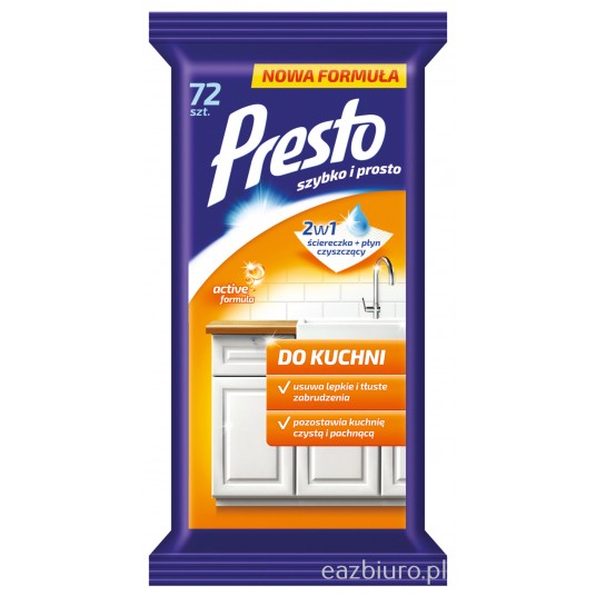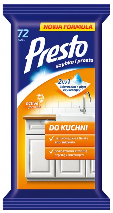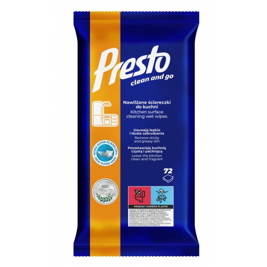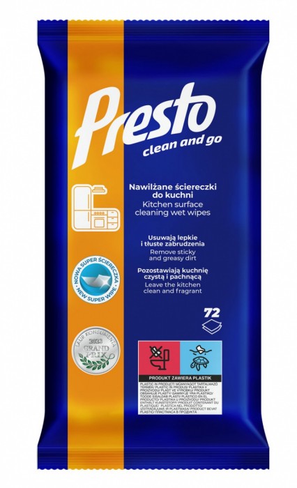 - Ściereczki nawilżane Presto do kuchni przeznaczone są do czyszczenia szafek i blatów, okapów oraz baterii kuchennych - Skutecznie usuwają tłuste i lepkie zabrudzenia dzięki zastosowaniu specjalnie dobranej kompozycji aktywnych substancji czyszczących - Ułatwiają kolejne mycie poprzez zastosowanie polimeru wnikającego w pory powierzchni i zabezpieczają ja przed wchłanianiem brudu - Pozostawiają lśniącą powierzchnie bez smug dzięki zawartości składnika przyspieszającego schnięcie - Zapewniają przyjemny, odświeżający zapach - Nie podrażniają skóry dłoni - 72 ściereczki w opakowaniu