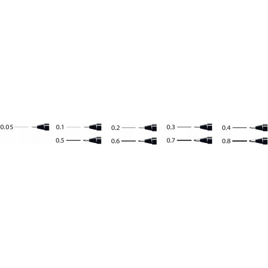 - Czarny: 0,03; 05; 0,1; 0,2; 0,3; 0,4; 0,5; 0,6; 0,7; 0,8; 0,9; 1,0; 1,2 mm + pędzelek