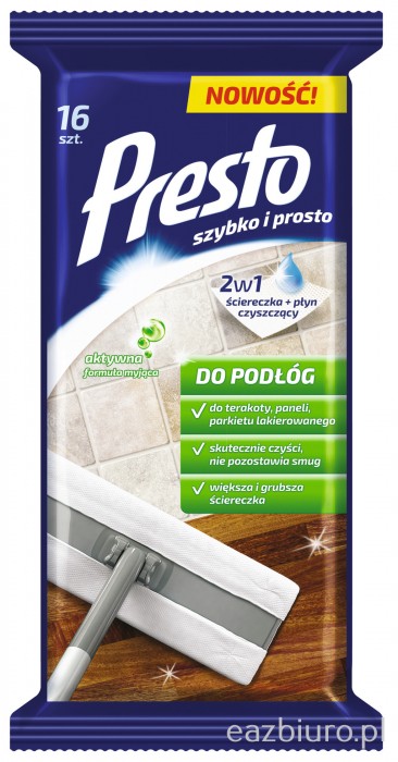 - Ściereczki gospodarcze Presto do podłóg są przeznaczone do czyszczenia paneli, terakoty, gresu czy drewna lakierowanego - Skutecznie usuwają zabrudzenia i zbierają kurz, a jednocześnie nie pozostawiają lepkiej warstwy na czyszczonej powierzchni - Aktywna formuła myjąca zawiera polimer, który wnika w pory powierzchni podłogi i zabezpiecza ja przed brudem - Ułatwiając kolejne mycie nie podrażniają skóry dłoni - 16 ściereczek w opakowaniu