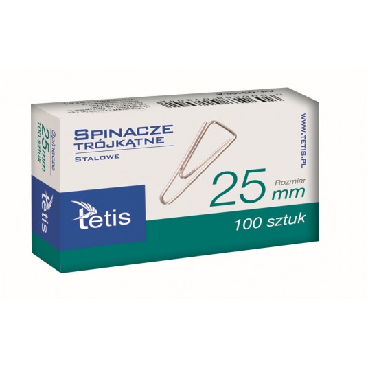 - Spinacze stalowe - Kształt: trójkątne - Opakowanie: pudełko 100 sztuk / 10 pudełek po 100 sztuk w opakowaniu zbiorczym - Kolor: srebrny - Rozmiar: 25 mm