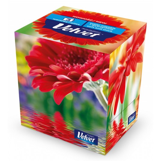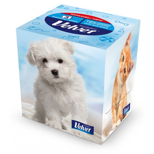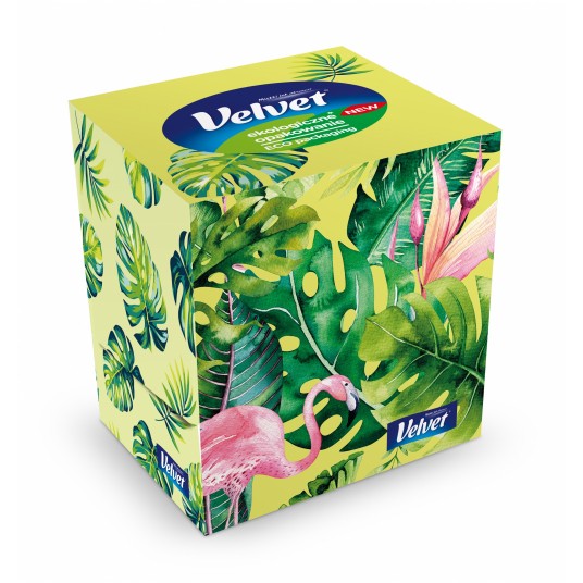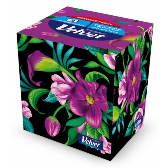 - Odkryj wyjątkowo miękkie i delikatne 3 warstwowe chusteczki uniwersalne Velvet w pudełku - Kompaktowe opakowanie chusteczek Velvet CUBE zajmuje niewiele miejsca - zmieści się na stoliku nocnym, małym stole kuchennym i na każdym biurku - NChusteczki Velvet CUBE to wyjątkowa oferta dla zwolenników nowoczesności i minimalizmu - Różnorodna i atrakcyjna grafika pudełek to gratka dla wszystkich, którzy cenią walory estetyczne i lubią harmonię we wnętrzu - To wyjątkowy produkt zamknięty w podręcznych i kolorowych pudełkach, który skutecznie, a delikatnie osuszy nosy dorosłym i dzieciom - Ich dużym atutem jest poręczność, łatwość wyciągania, dzięki czemu można po nie sięgnąć w każdej chwili - Warto mieć je pod ręką, aby wykorzystywać walory higieniczne i pielęgnacyjne choćby do: poprawek makijażu, demakijażu, zmywania lakieru z paznokci, usuwania nadmiaru sebum, usuwania nadmiaru pomadki, ścierania maseczek pielęgnacyjnych - Nowe opakowania w 100% nadają się do recyklingu - Lakier UV, którym pokryty był dotychczasowy kartonik zastąpiliśmy lakierem dyspersyjnym (rozpuszczalnym w wodzie) - Ponadto, kartoniki zostały wykonane z tekstury makulaturowej - Opakowania posiadają certyfikat FSC - Produkt posiada atest PZH - Uwaga! Chusteczki uniwersalne Velvet Cube to mix 4 wzorów graficznych na opakowaniu. Wzory wysyłane losowo! Nie ma możliwości wyboru konkretnego - Ilość chusteczek w pudełku: 56 sztuk - Ilość warstw: 3 warstwy - Typ: bezzapachowe - Opakowania: mix 4 wzorów – wybór losowy - Surowiec: 100% celuloza