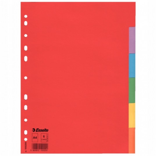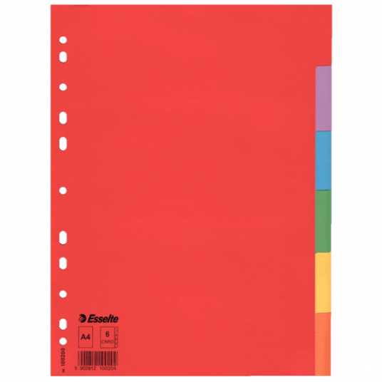 - 6 kolorowych przekładek ułatwiających sortowanie - 11 uniwersalnych otworów umożliwiających wpinanie do segragatora - Format A4 - Mocny karton o gramaturze 160 gsm - Wykonane z wysokiej jakości kartonu pochodzącego z odzysku - Posiadają certyfikat Blue Angel