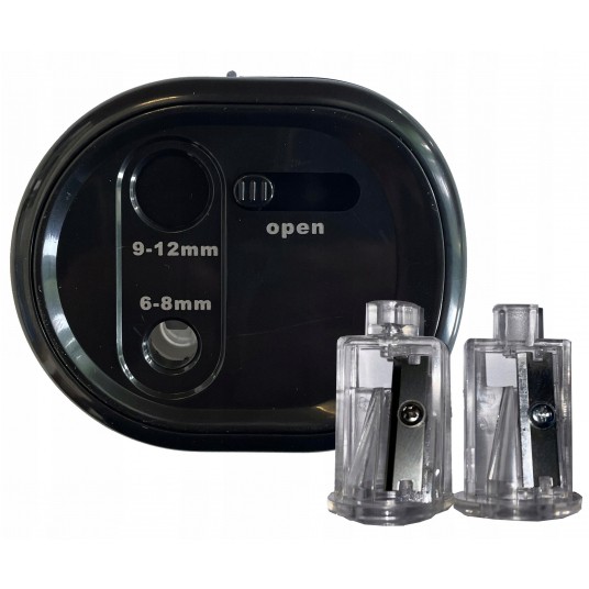 - Dwuotworowa, do ołówków o średnicy 6–8 i 9–12 mm - Bezpieczny dla dzieci przełącznik rozmiaru ołówka rozmiaru ołówka - Trwały mechanizm z dwoma wysokiej jakości ostrzami ze stali węglowej ze stali węglowej - Ostrza wymienne - Na baterie AA (4 szt., nie dołączono) - Stabilna podstawa - 3 lata gwarancji - instrukcja obługi