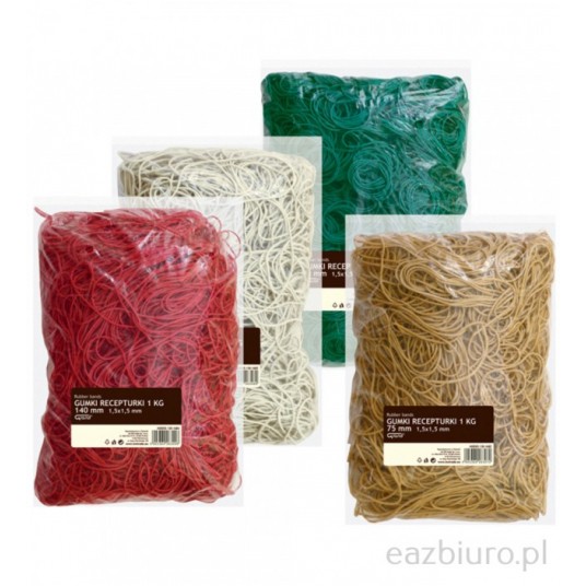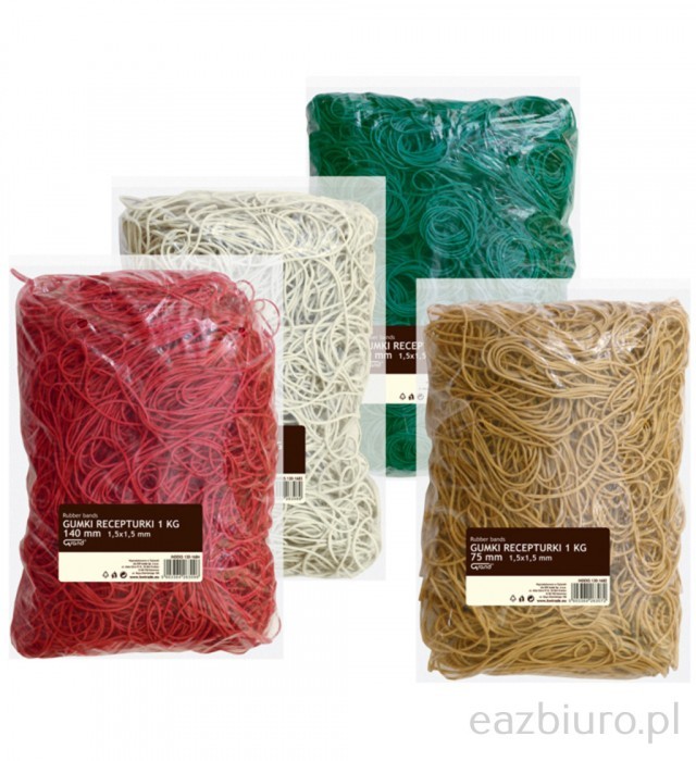 - Elastyczne gumki - Dostępne w 4 kolorach: naturalnym, czerwonym, zielonym oraz białym - Pakowane w woreczki - Rozmiar: 1,5 x 1,5 mm - Średnica: 50 mm - Długość po złożeniu: 8 cm - Opak. 1 kg
