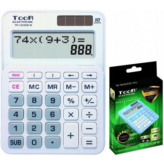 – Dwuliniowy wyświetlacz – 10-pozycyjny – Kasowanie ostatniej pozycji – Klawisze przechodzenia pomiędzy cyframi – Wykonywanie działań w nawiasach – Obliczanie procentu – Pamięć – Klawisz zmiany znaku – Zasilanie bateryjne i słoneczne – Rozmiar: 148x105x20 mm – Z godny z wymaganiami UE – Dożywotnia gwarancja – instrukcja obsługi